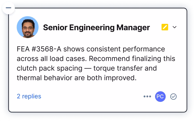 Use CoLab to make CAD accessible in the browser, so anyone can explore the model and add feedback — without needing special tools or training. In live reviews, engineers see each other’s comments appear in real time, sparking better ideas and discussions.