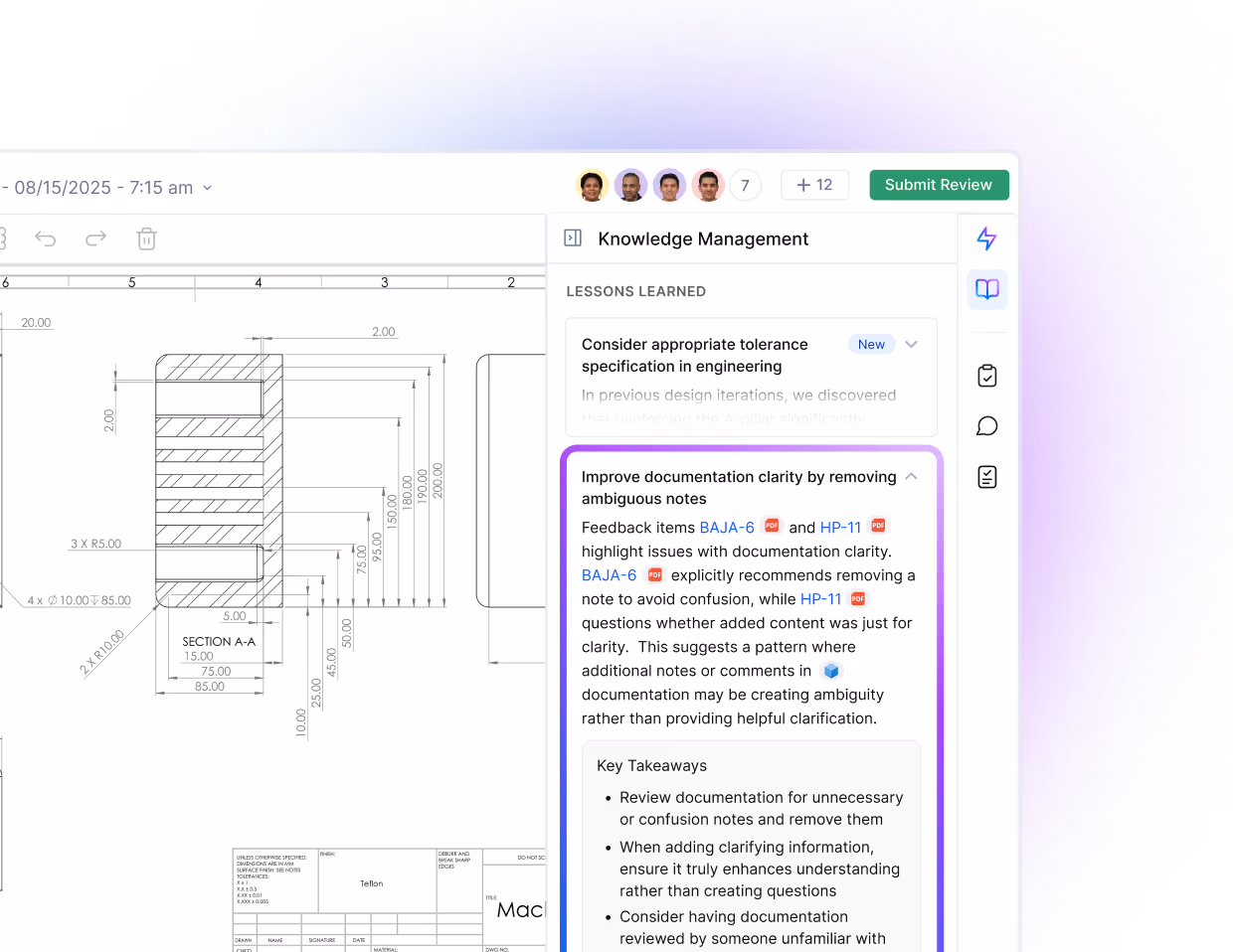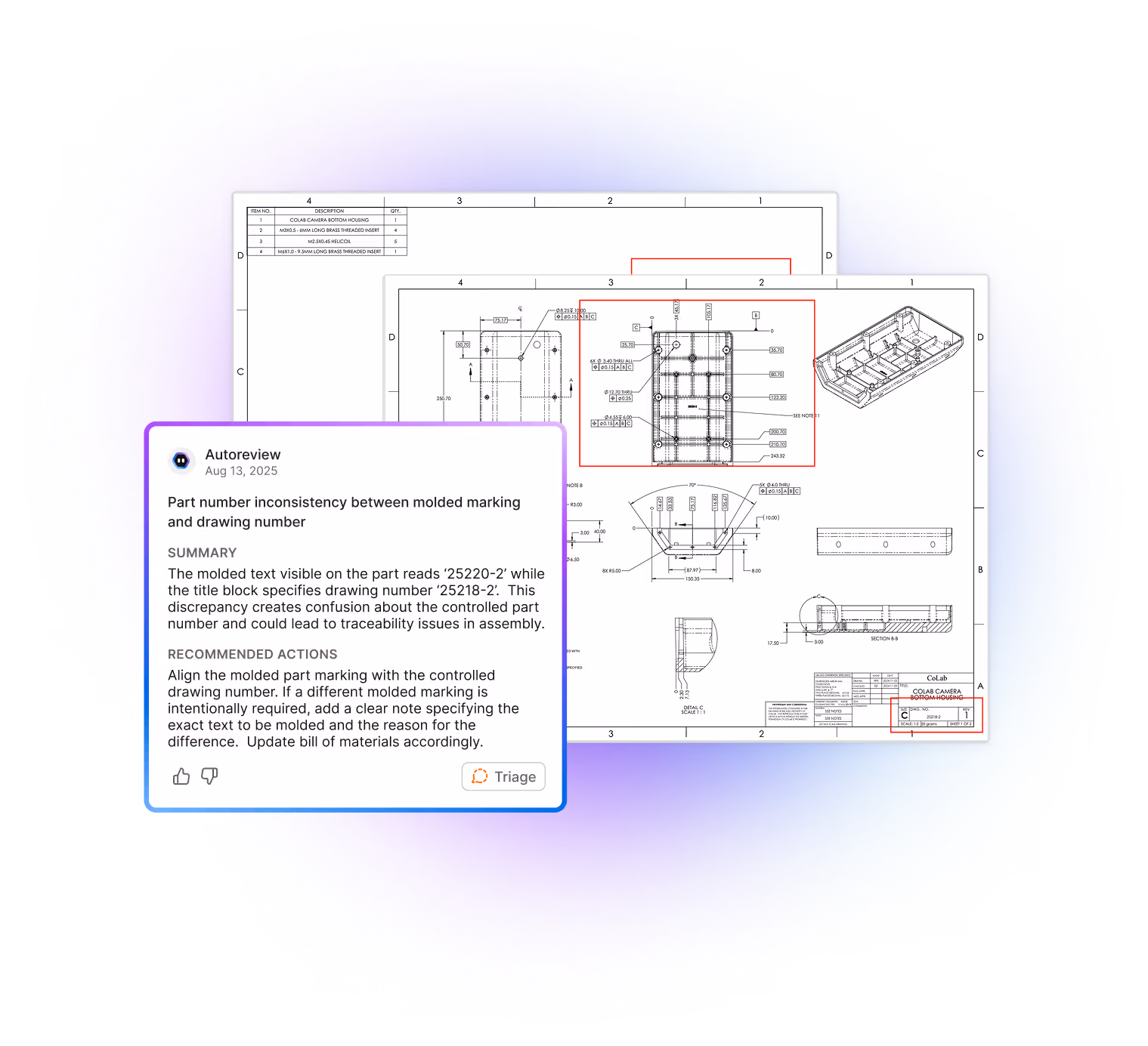 Before AI can give useful feedback, it needs to understand how drawings work. CoLab goes beyond generic image recognition, guiding AutoReview with system-level prompts based on how real engineers review drawings. AutoReview understands what different elements of a drawing mean, the order they should be reviewed in, and how to cross-check details for consistency.