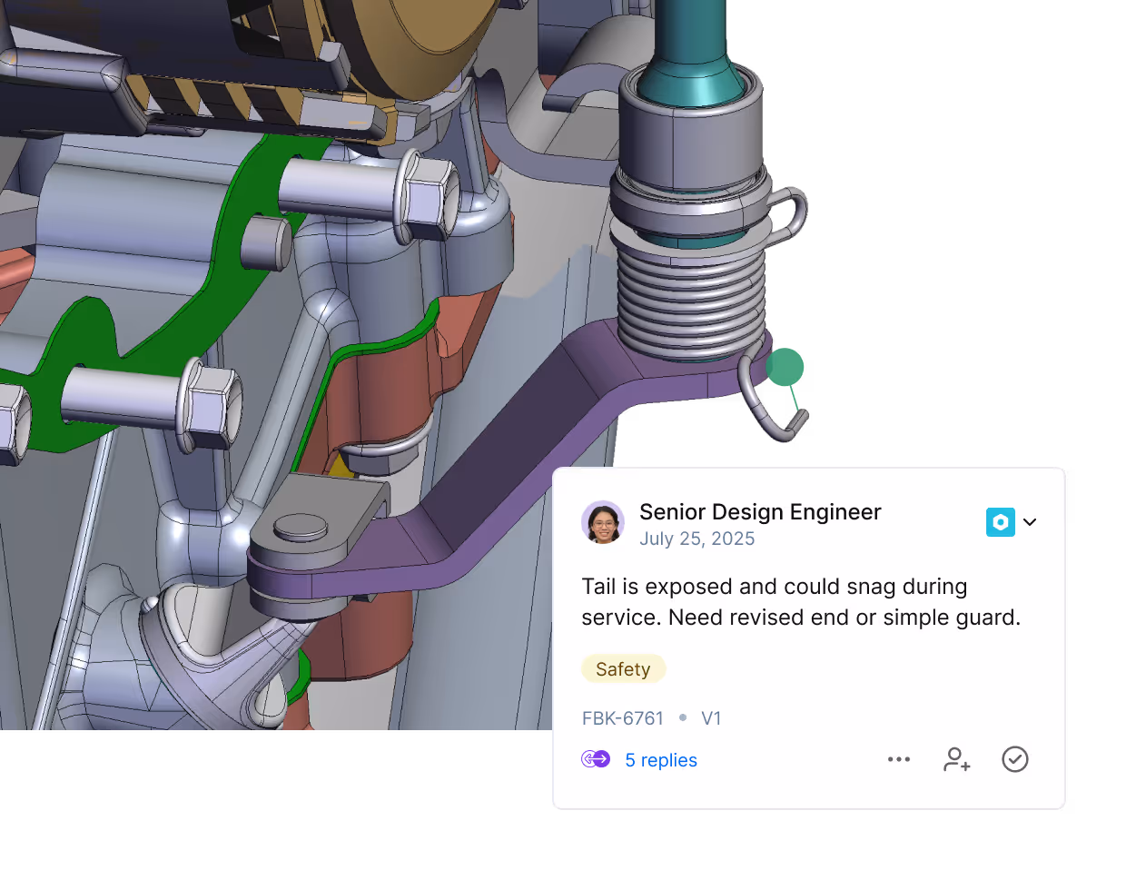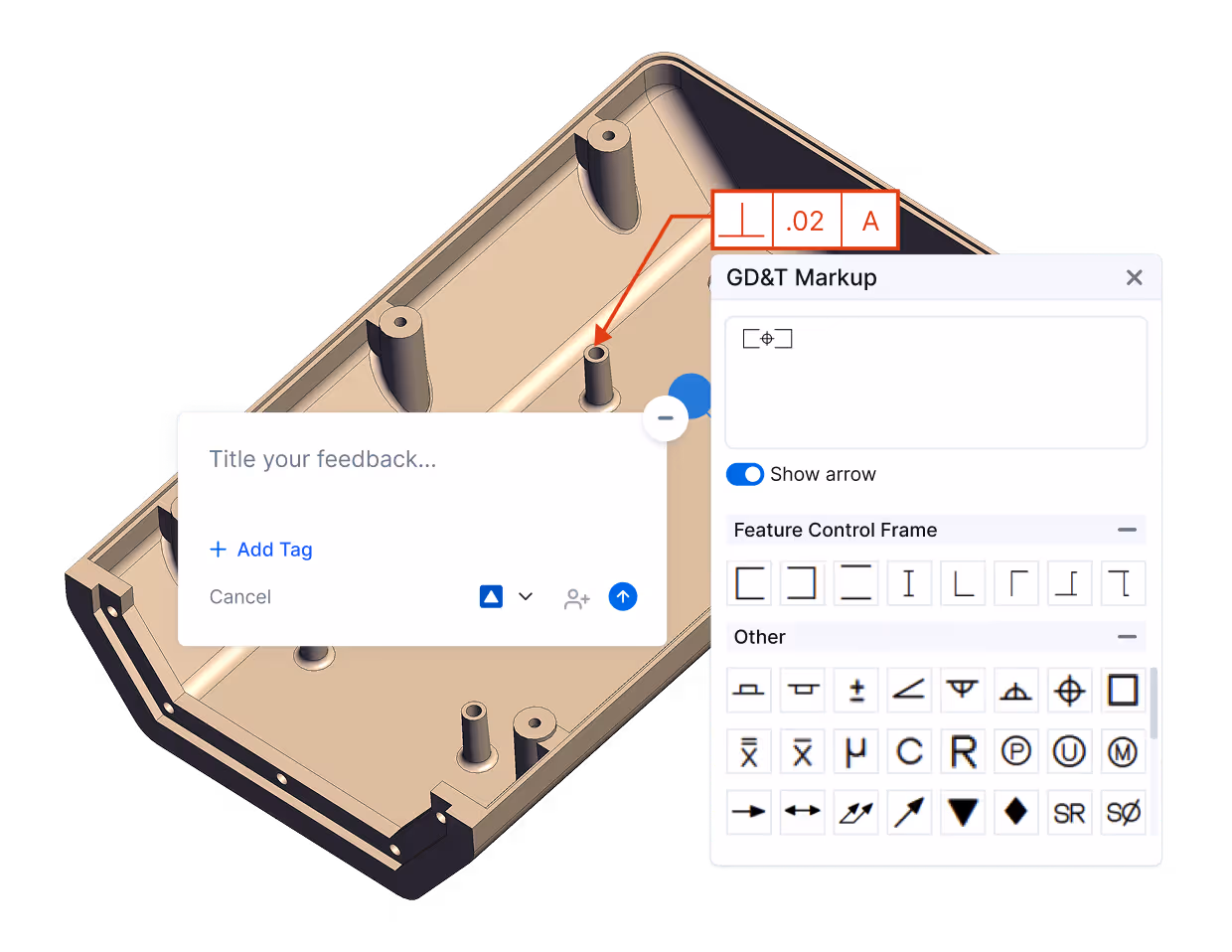 CoLab includes all the standard markup tools engineers expect — arrows, shapes, highlights, and text boxes — so you can make your feedback clear. You can even annotate with GD&T symbols and feature control frames.