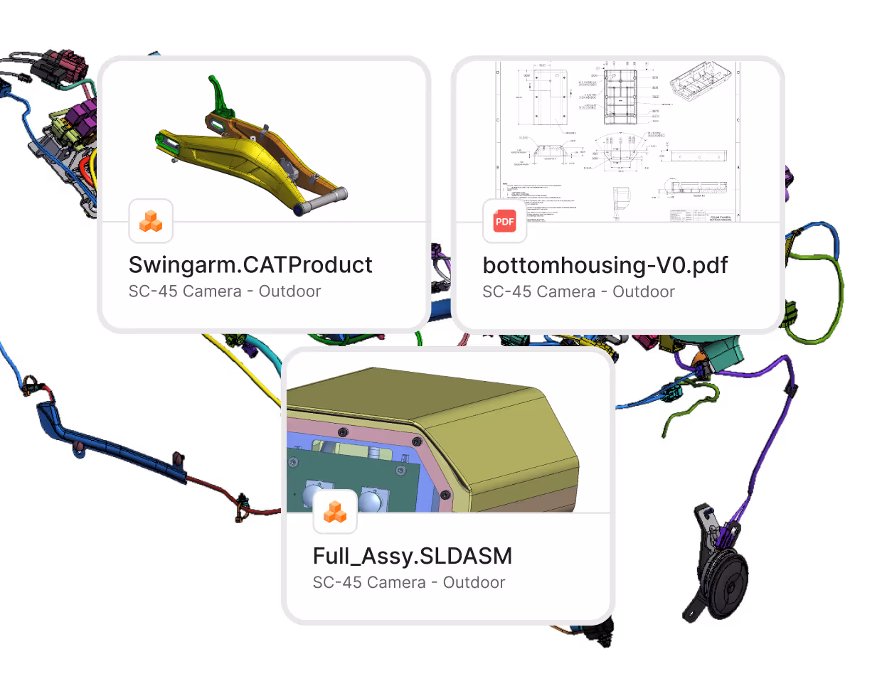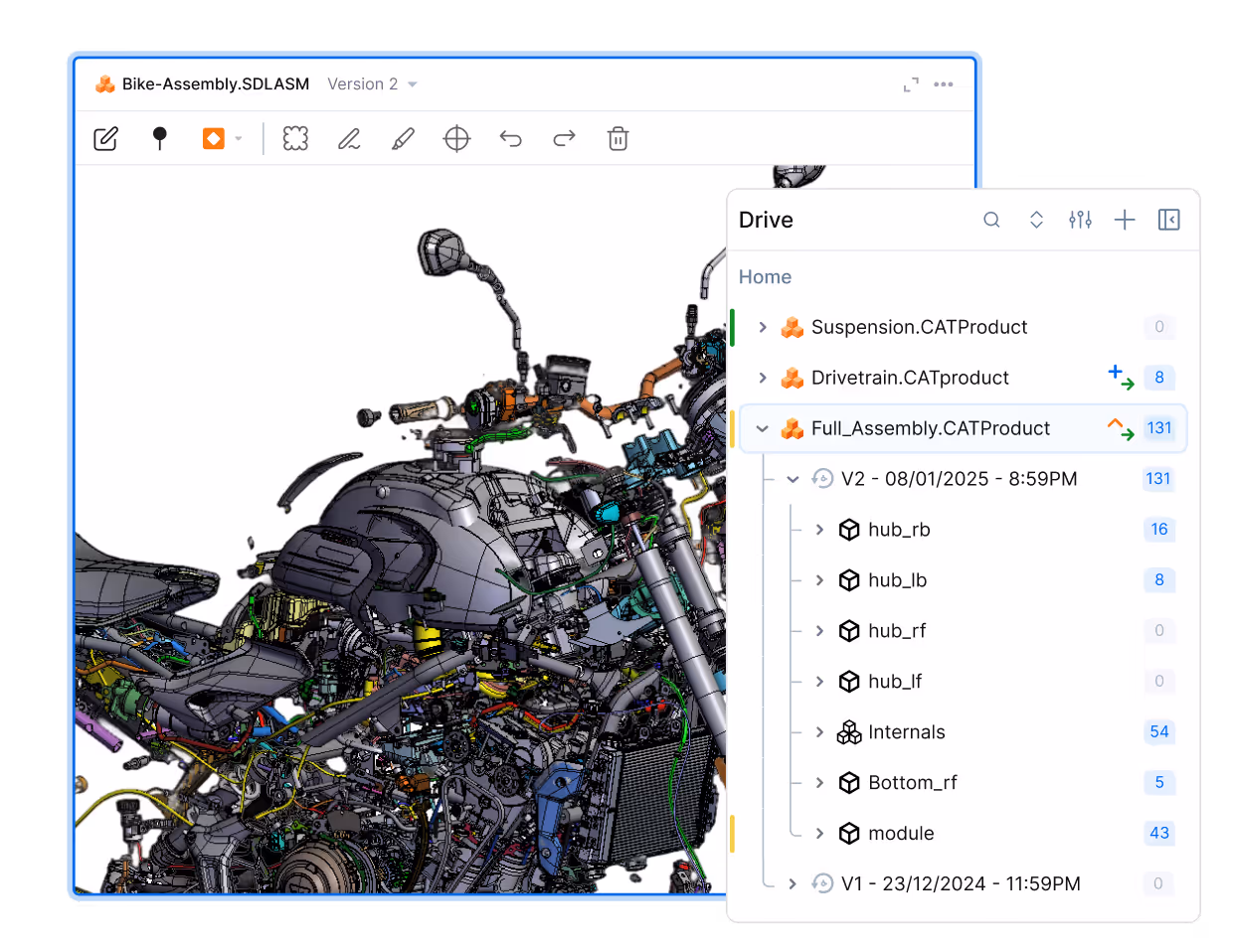 Whether you’re loading a small part or a full product assembly, CoLab’s viewer is optimized for speed. Native CAD and neutral formats are automatically converted into lightweight, web-viewable files, so you can pan, rotate, and inspect large models smoothly.