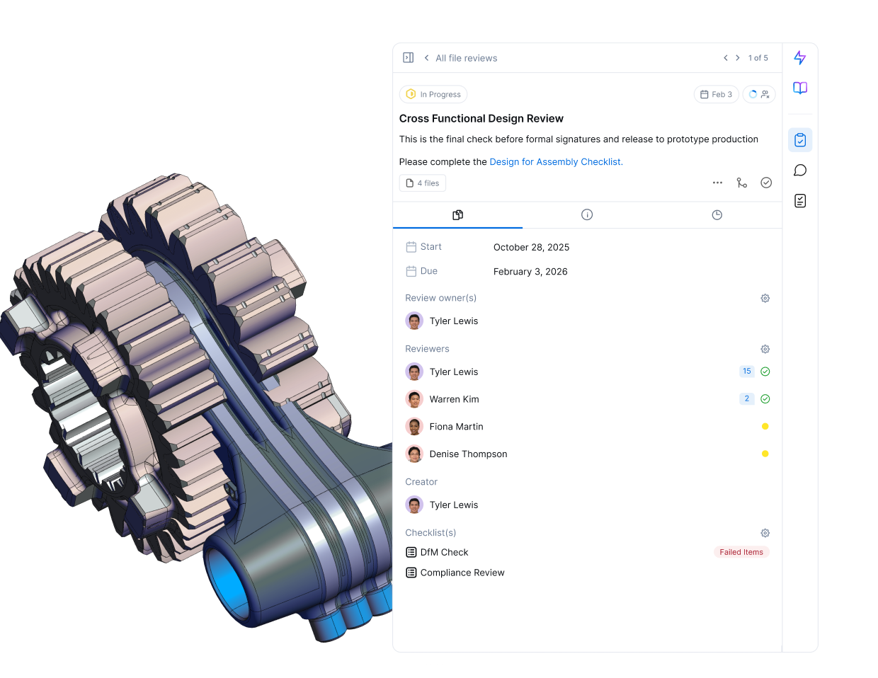 Include related models, drawings, or documents in one review instead of reviewing each file separately. Reviewers can move between files easily and keep feedback organized within the review.